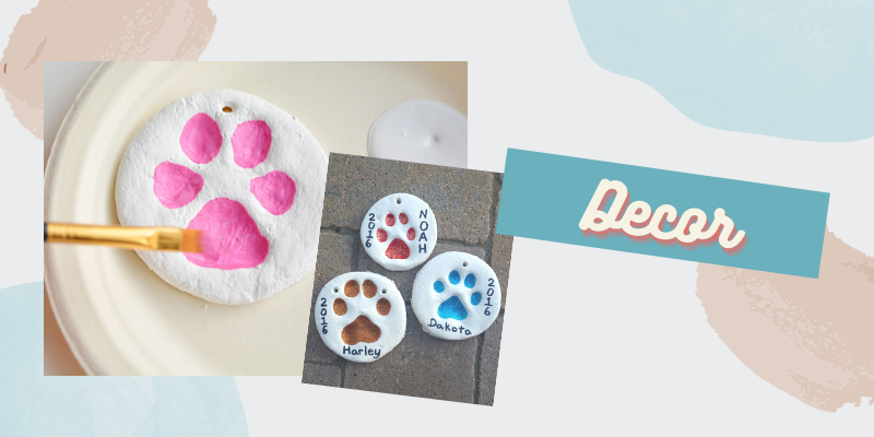 This is one of the easiest ways to create some “clay-like” décor pieces in your home with your pet’s paw print embossed into it. First, you’ll have to make a quick salt dough. To do this, mix hot water, salt and flour. Kneed it in your hands until it forms a dough ball. Add some flour if it’s too sticky. Then, roll the dough until it is about ¼ to ½ inches thick and use cups to cut out circular shapes. Have your pet step deep into the circular cut dough and bake them at 225 degrees F for 2-3 hours until dried out. You can leave it as is or paint and decorate it!