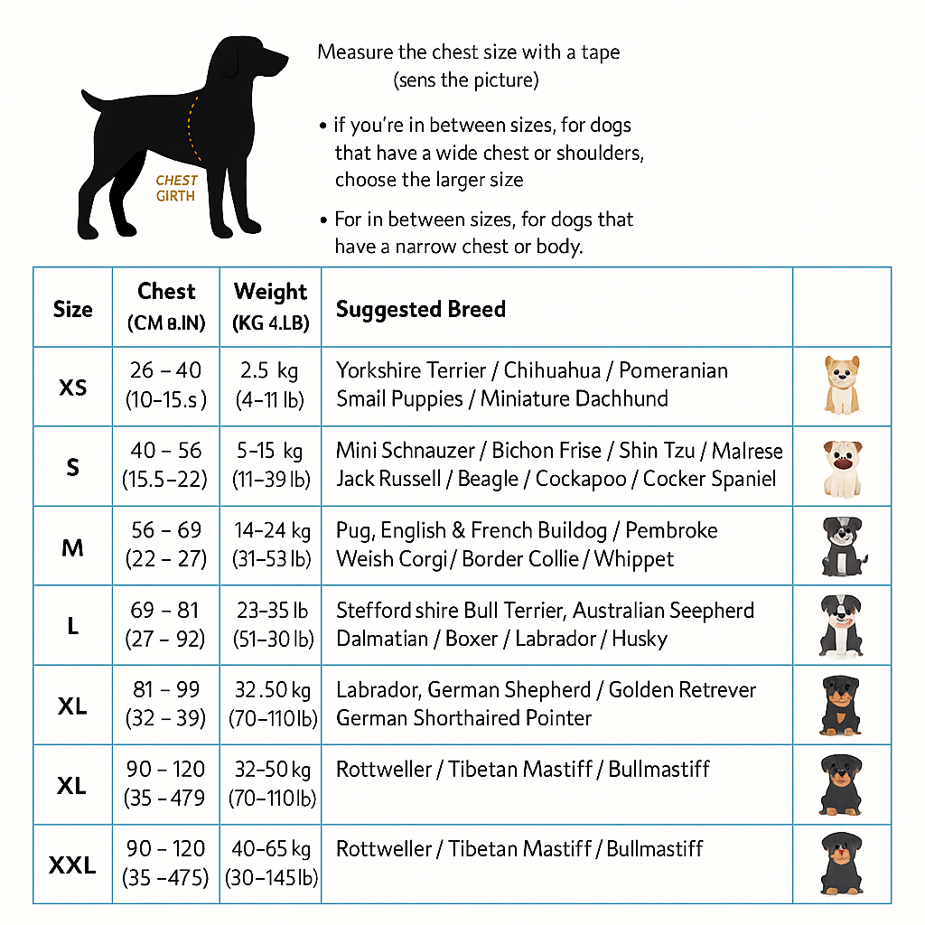 Re-check fit regularly as your dog’s size may change with age or activity