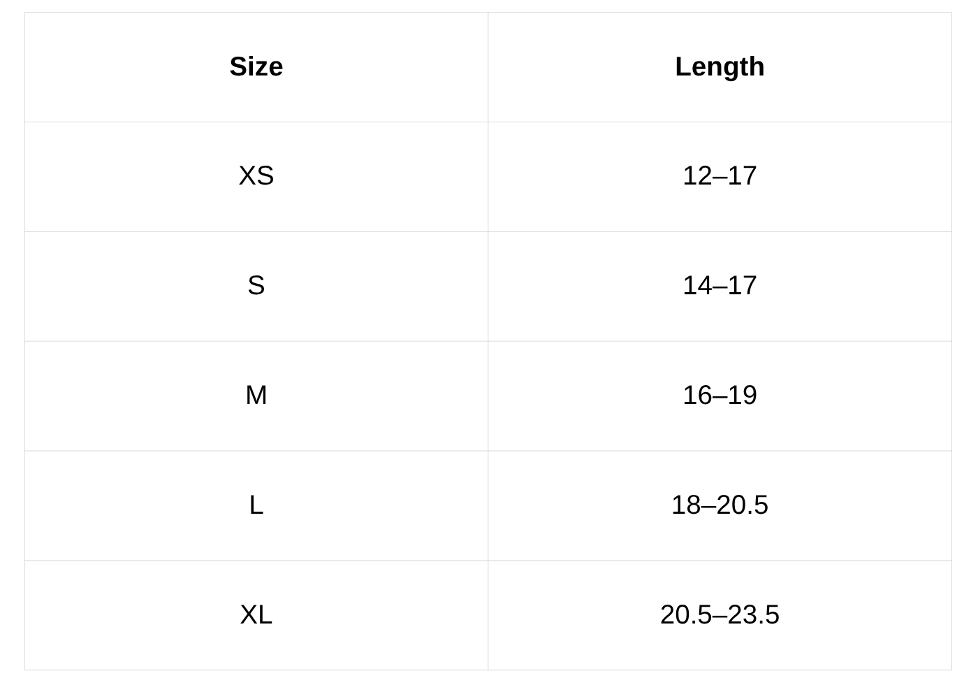 Size Chart (inches):