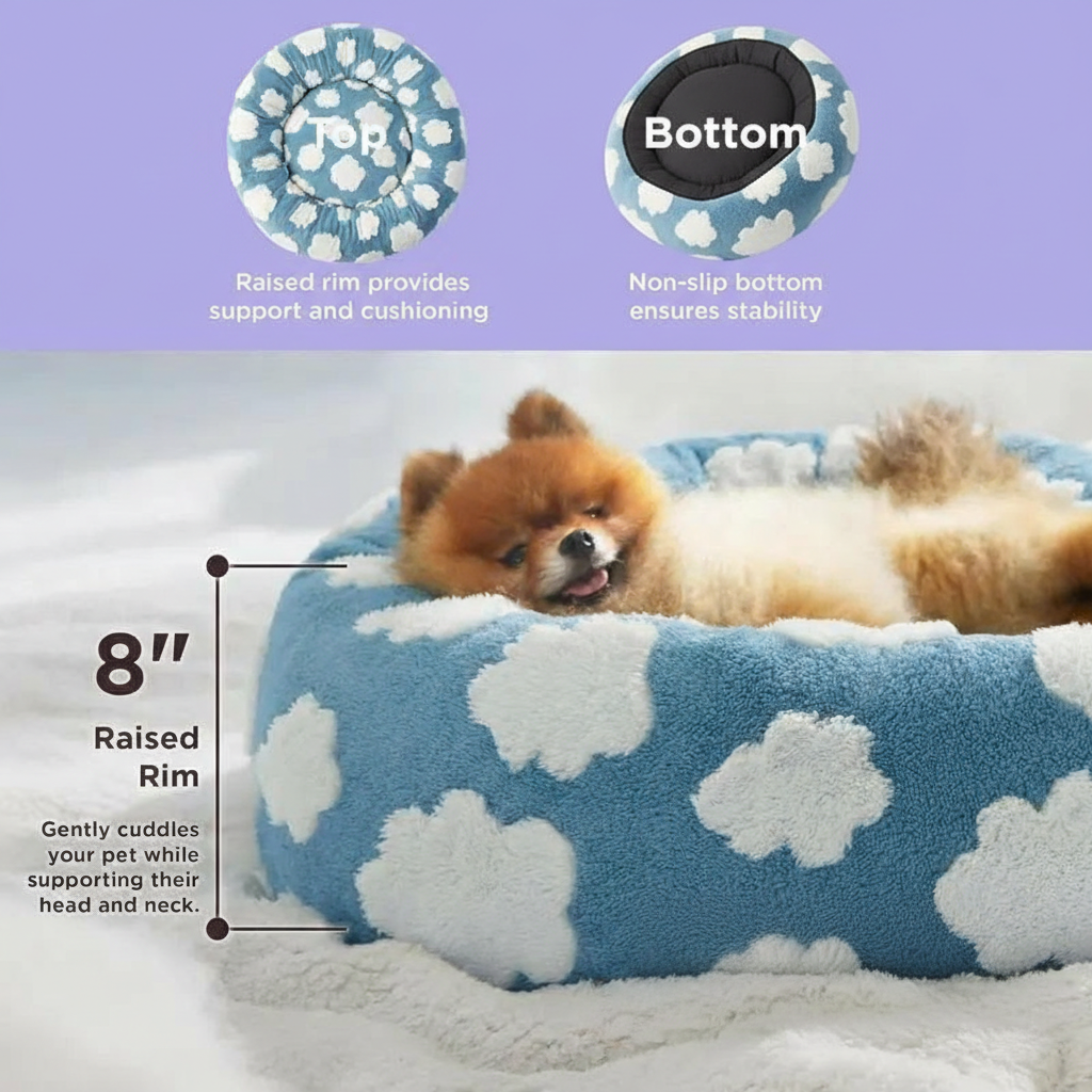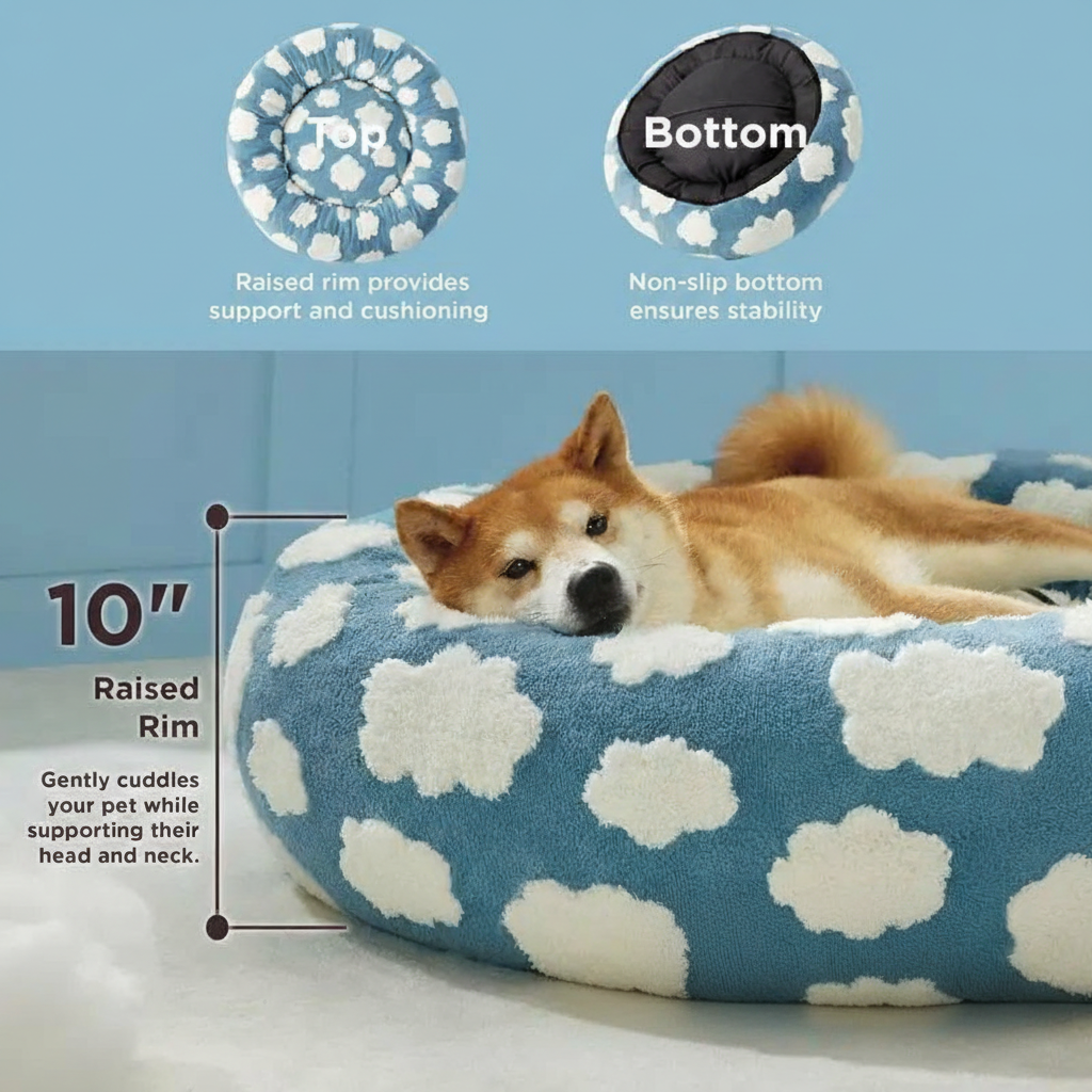 This round model includes a slip-resistant base that helps limit motion when placed on smooth flooring. This base material allows the bed to maintain its position during entry or minor shifts by the animal. The overall shape is symmetrical, making it easy to place in corners, beside furniture, or within crates.