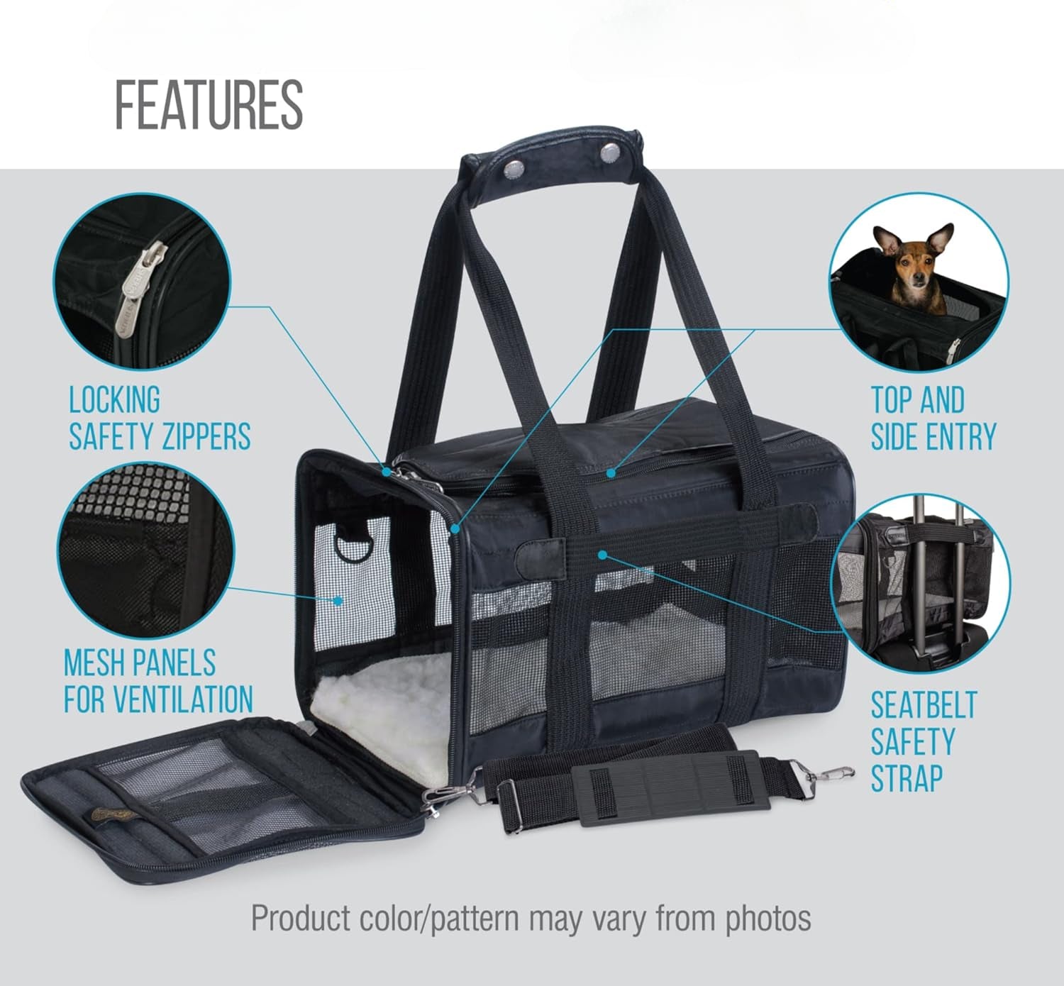 Travel effortlessly with this Travel Pet Carrier For Airlines, designed to fit under airplane seats. It features a spring wire frame, ventilated mesh panels, secure zippers, and a waterproof base with a removable liner for easy cleaning. The versatile design includes a carry strap and storage pocket, superb for air, car, and train travel, as well as vet visits and daily outings.